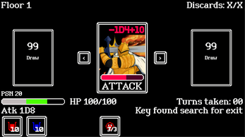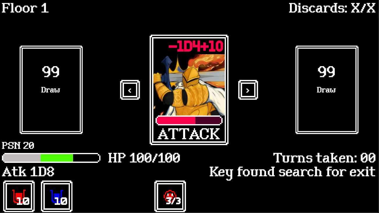 Choose what deck to draw from and choose what deck to discard to. Slay monsters to find the key to get to the next floor. Each monster will be developed with their own strengths and weaknesses. Interact with monsters to deal a dice roll amount of damage displayed below then monsters will attack back. Open chest to gain useful consumables. Try to clear all floors. The goal is to create a game about become a monster ensyclopedia and learning and memorizing unique mechanics or stats so some mechanics are gonna be meant for you to find on your own trial and error is part of the experience.